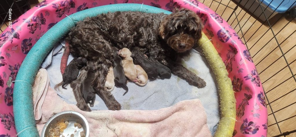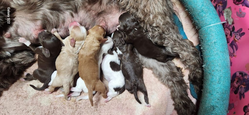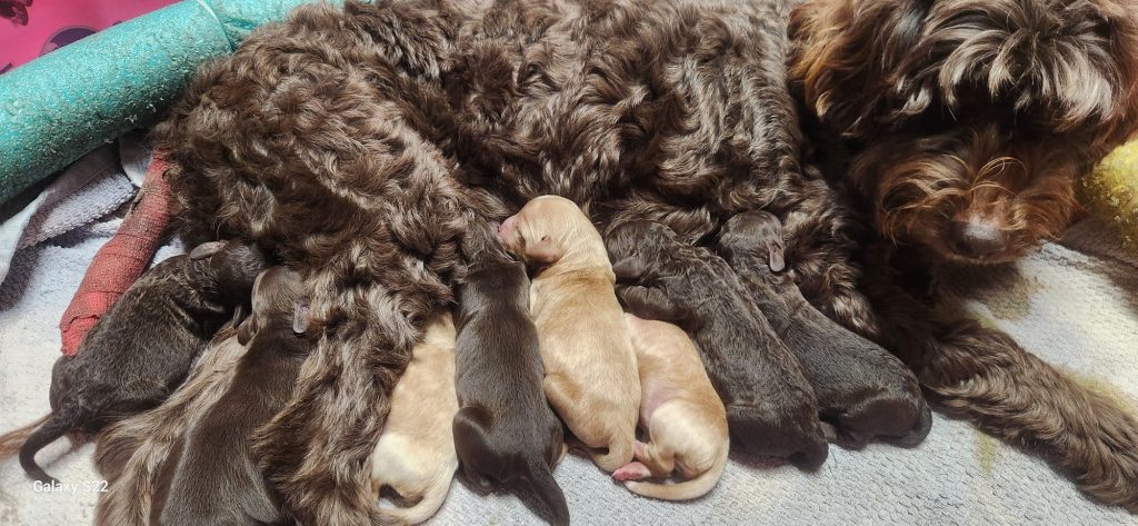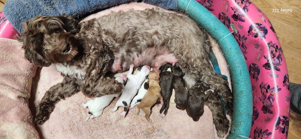 Cocoa, another of our dams, has had the same picture package treatment, along with her own little bundle of puppies.